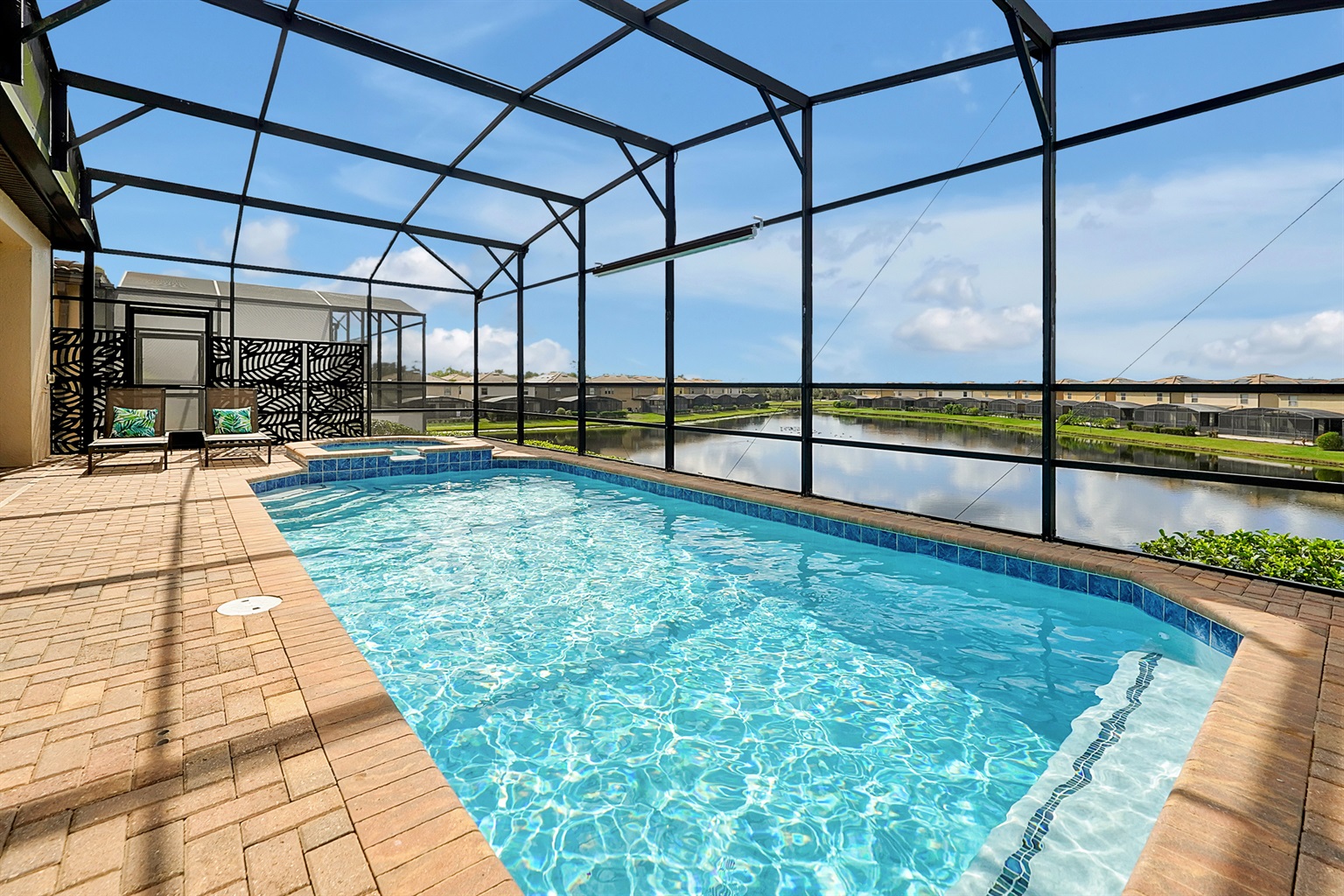 Home Highlights: Incredible Jurassic Park Theme Arcade Game Room - 2 Movie Theaters (one Star Wars theme inside the home and one poolside) - 5 King Suites - 4 Themed Bedrooms - Private West Facing Heated Pool/Spa (heating extra $) - Incredible View Of The Large Pond Behind - Covered Lanai With Bar And TV, Dining Table, And Plenty Of Seating