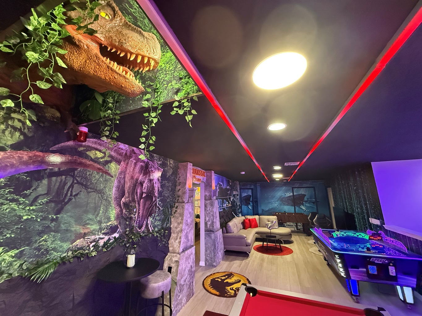 In-Home Entertainment: Jurassic Park Themed Arcade Game Room (Arcade Games: Aliens Extermination, Outrun Car Racing, Speed Air Hockey and Street Basketball. All of these arcade games are FREE-TO-PLAY!) - Pool Table - Xbox Console With Screen - Star Wars Themed Movie Theater - Living Room With 75" Flat Screen Smart TV - Smart Flat Screen TVs In Every Bedroom - FREE WiFi